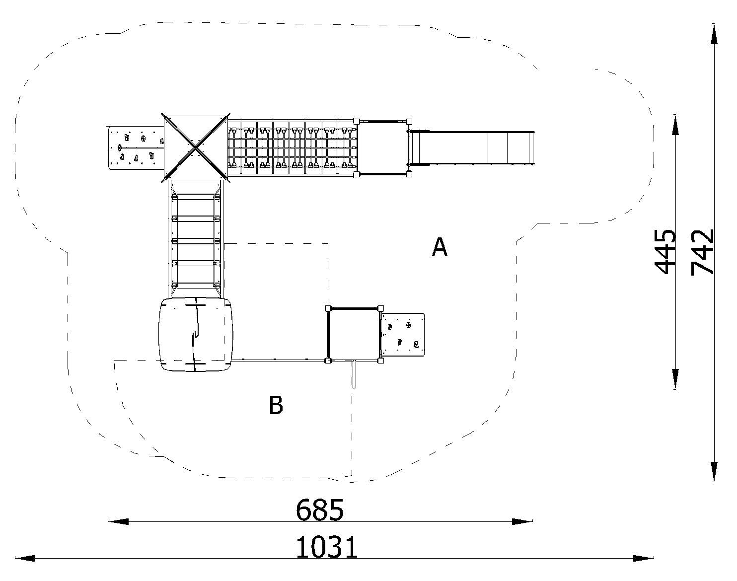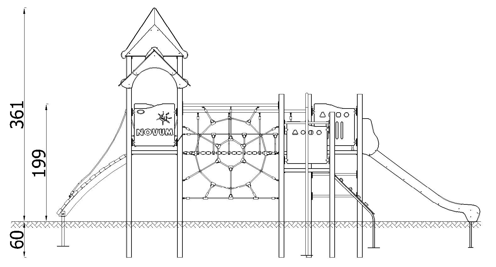 Komplekti kuuluvad liumägi, tuletõrjujatoru, köisarkaad ning köissild ja liikuv sild, mis pakuvad lastele rõõmu ja innustavad neid füüsiliselt aktiivsed olema. Ronida saab redeli, ronimisrambi ja käigutee abil. Tervikut täiendavad ettevõtte logoga ажuursed paneelid, luues loodusega kooskõlas oleva mänguruumi. Standardse liumäe on võimalik asendada PE-liumäega (küsi lisainfot!).