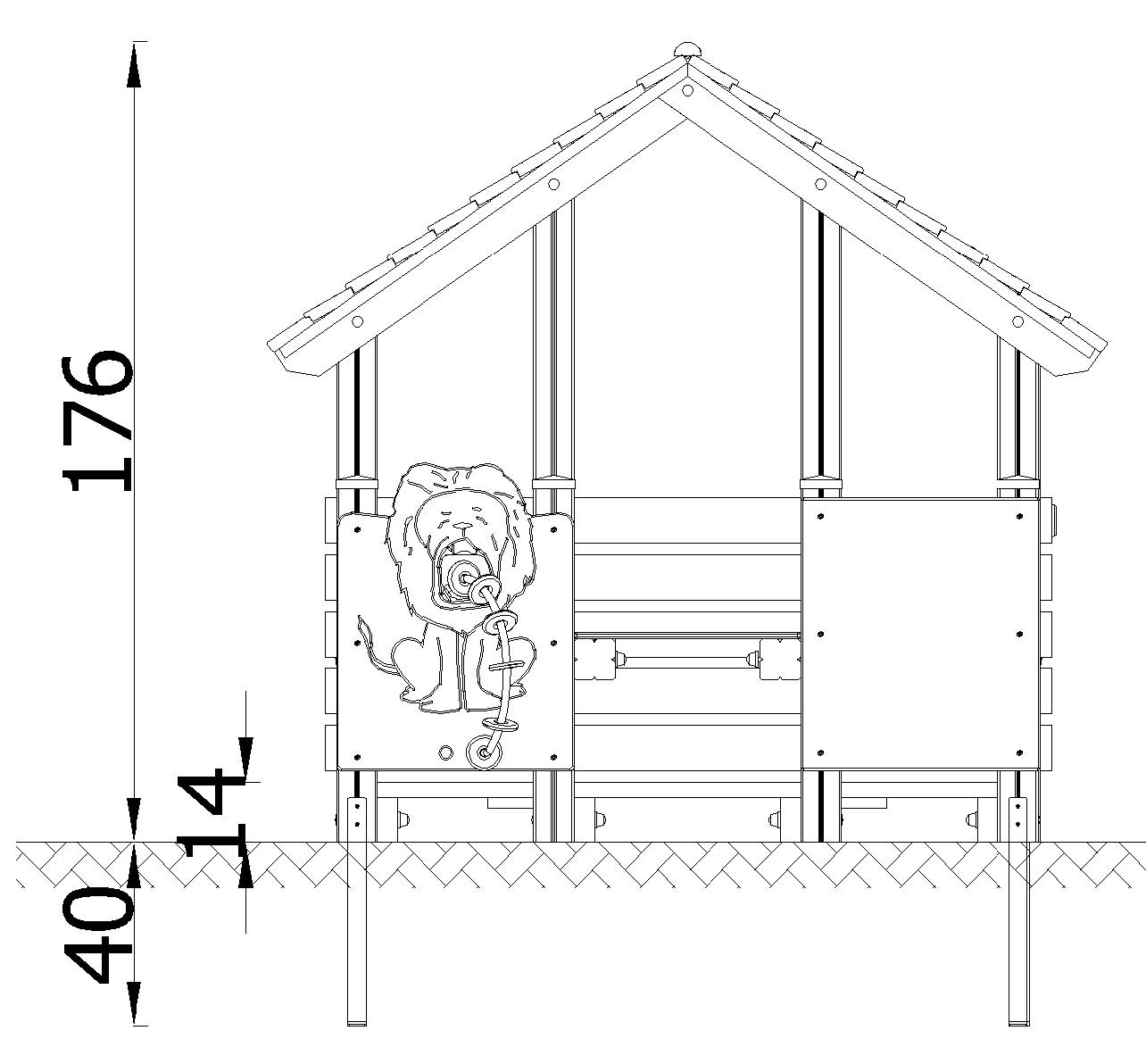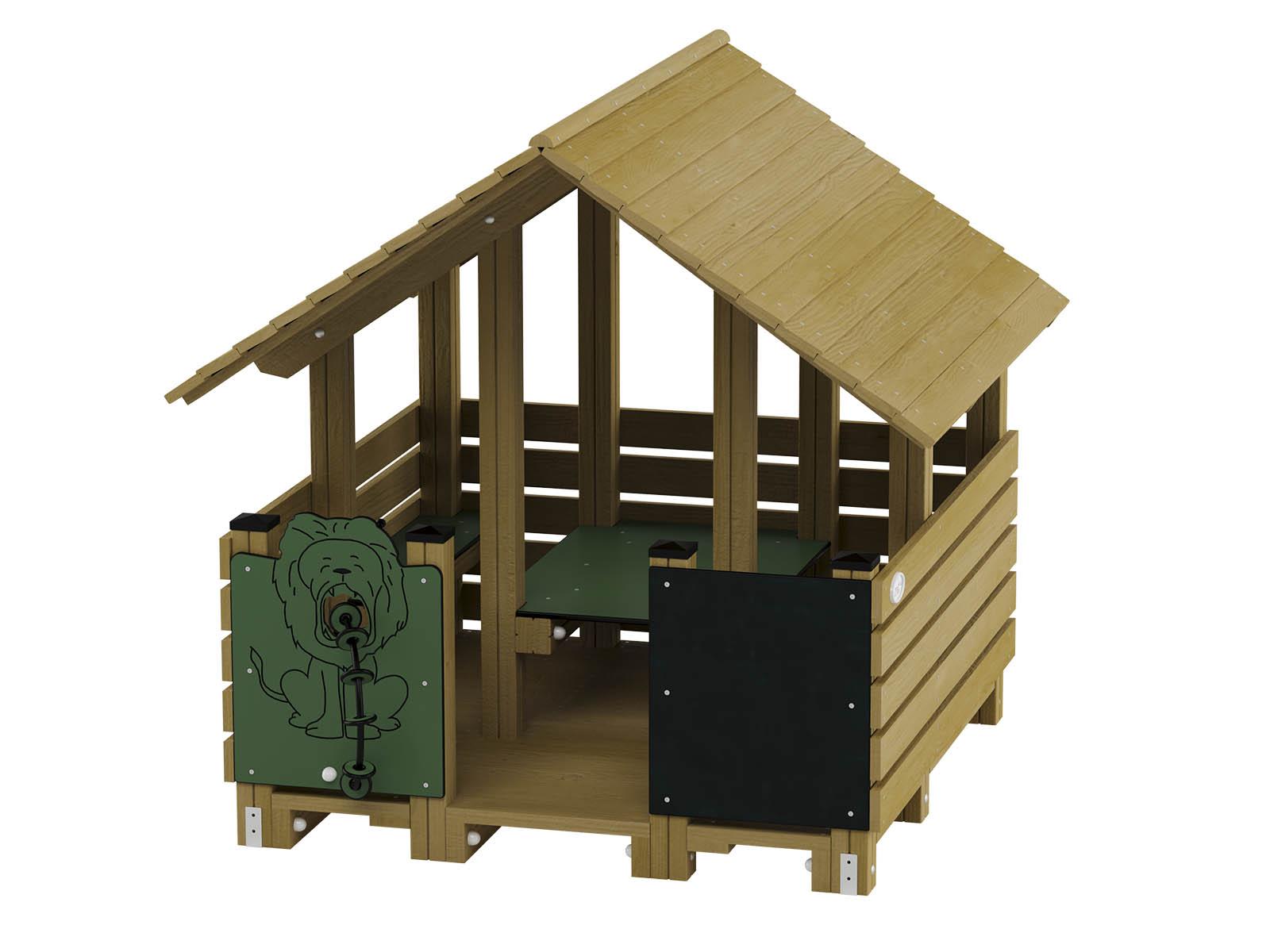 See mängumaja on suurepärane koht mängimiseks ja lõõgastumiseks. Sees on laud ja pingid, mis soodustavad koos söömist, joonistamist või lõõgastumist. Mängumaja ees on hariv lõvikujuline tegeluspaneel, mis rõõmustab lapsi ja julgustab uurima. Naturaalsest puidust konstruktsioon muudab mängumaja vastupidavaks ja sobivaks igasse lasteaeda või mänguväljakule.