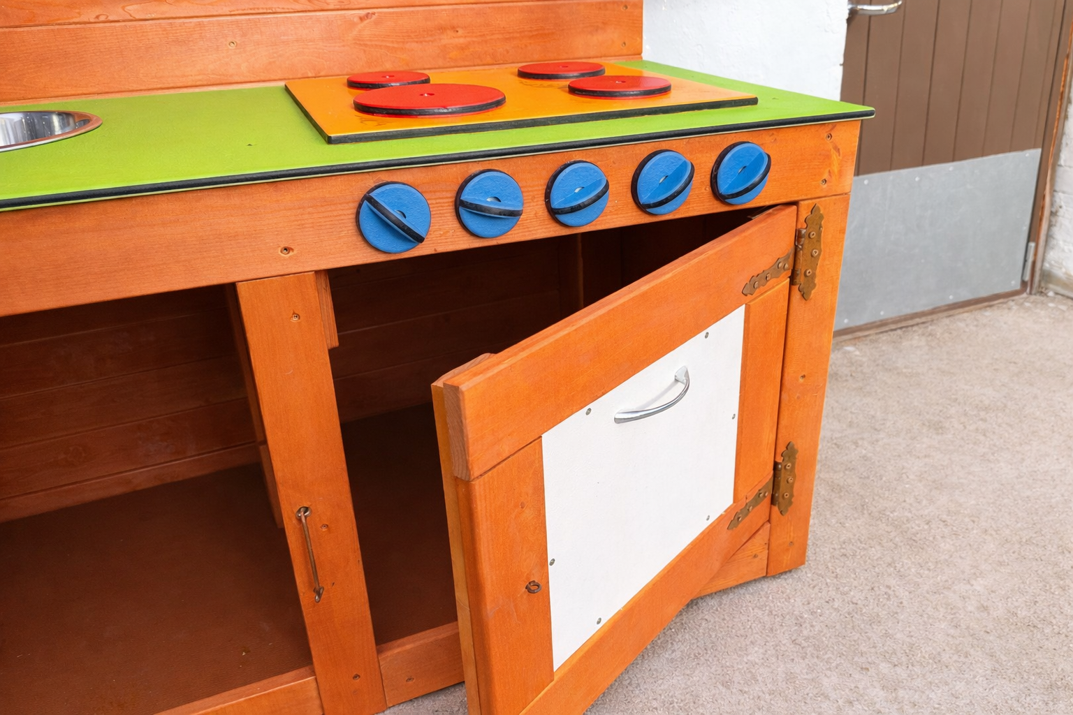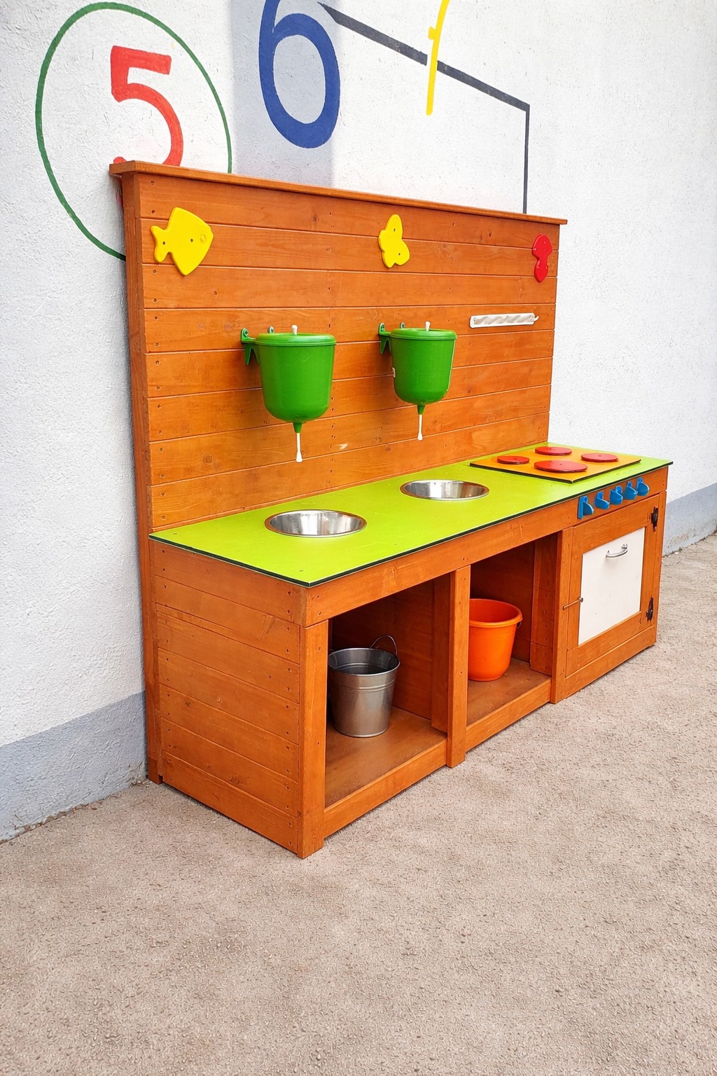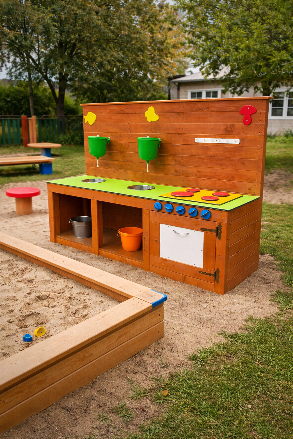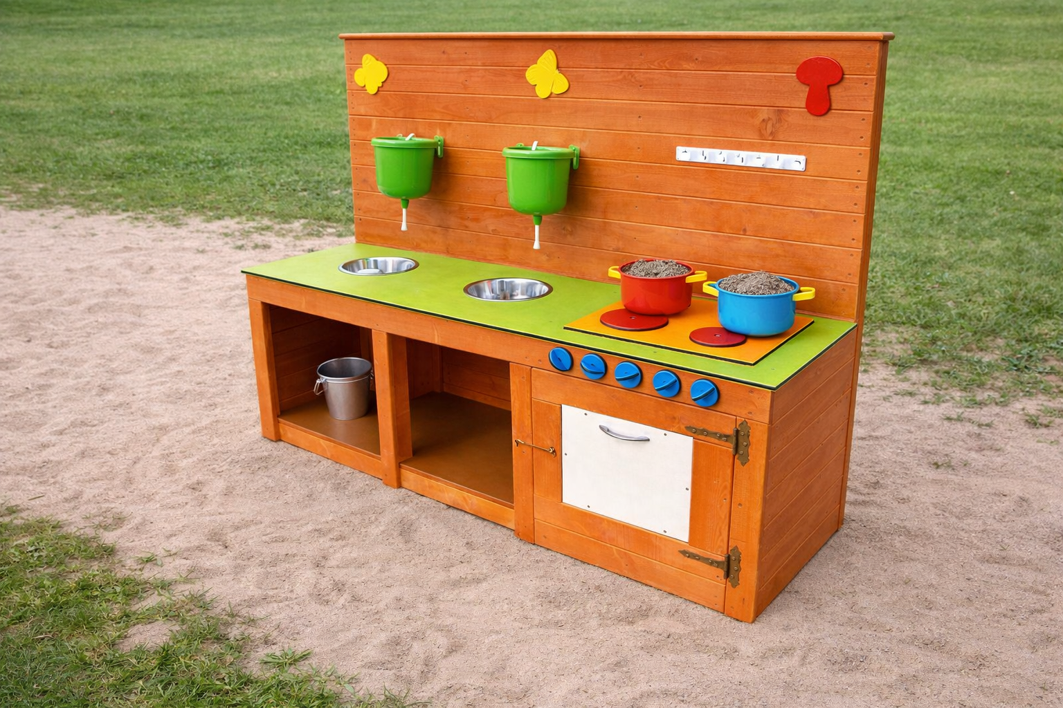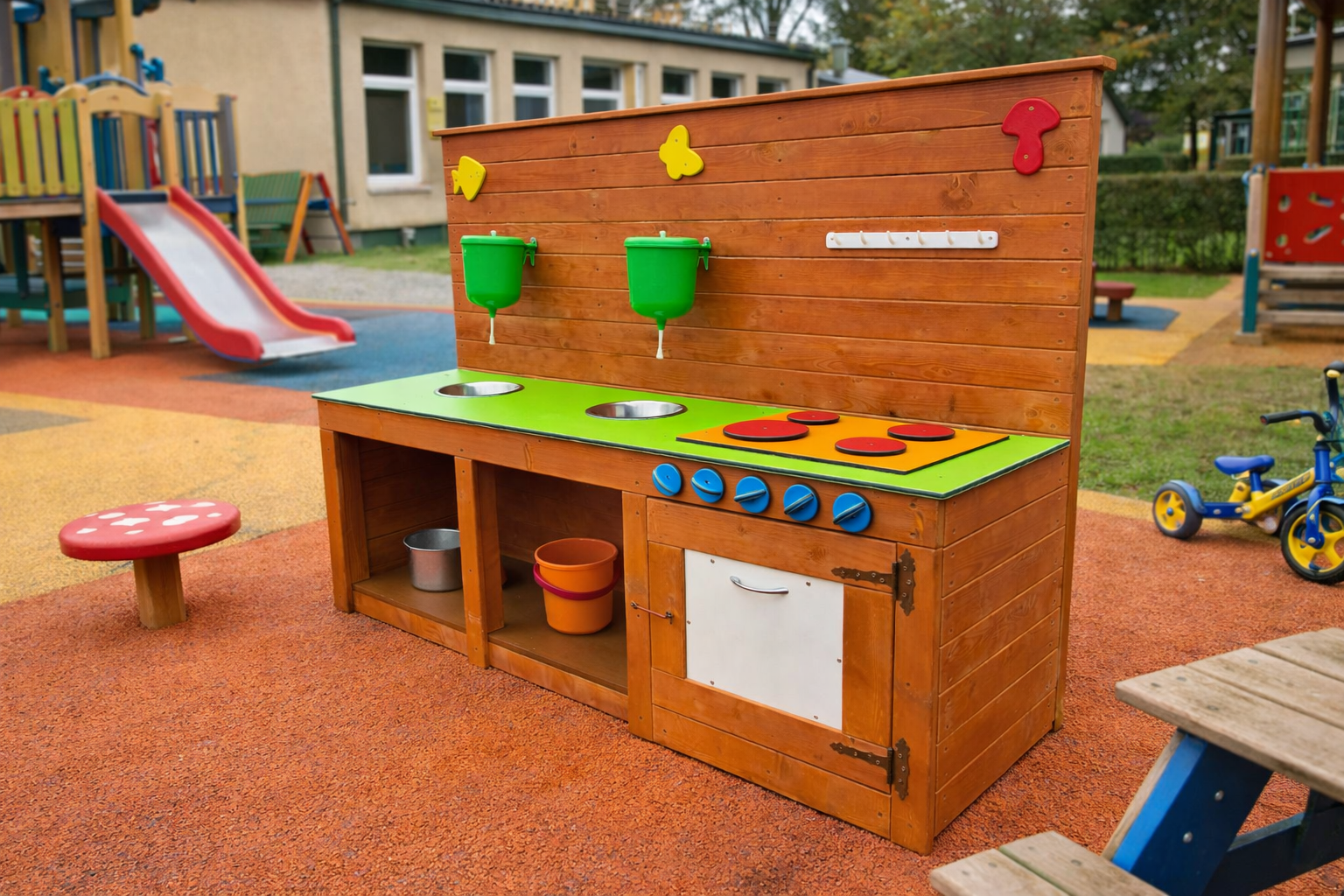 Mudaköök on ideaalne mänguelement lasteaedadele ja mänguväljakutele, kus lapsed saavad nautida loovat ja arendavat rollimängu vabas õhus. See mänguköök pakub lastele võimalust “kokata” liiva, vee ja looduslike materjalidega, arendades samal ajal fantaasiat ja sotsiaalseid oskusi. Köögil on kaks roostevabast terasest kaussi, mis sobivad suurepäraselt vee ja liivaga mängimiseks, ning praktilised anumad vee hoidmiseks. Realistlik pliidiala ja pööratavad nupud muudavad mängu veelgi kaasahaaravamaks. Avatud riiulid ja kapp pakuvad ruumi mängutarvikute hoiustamiseks.