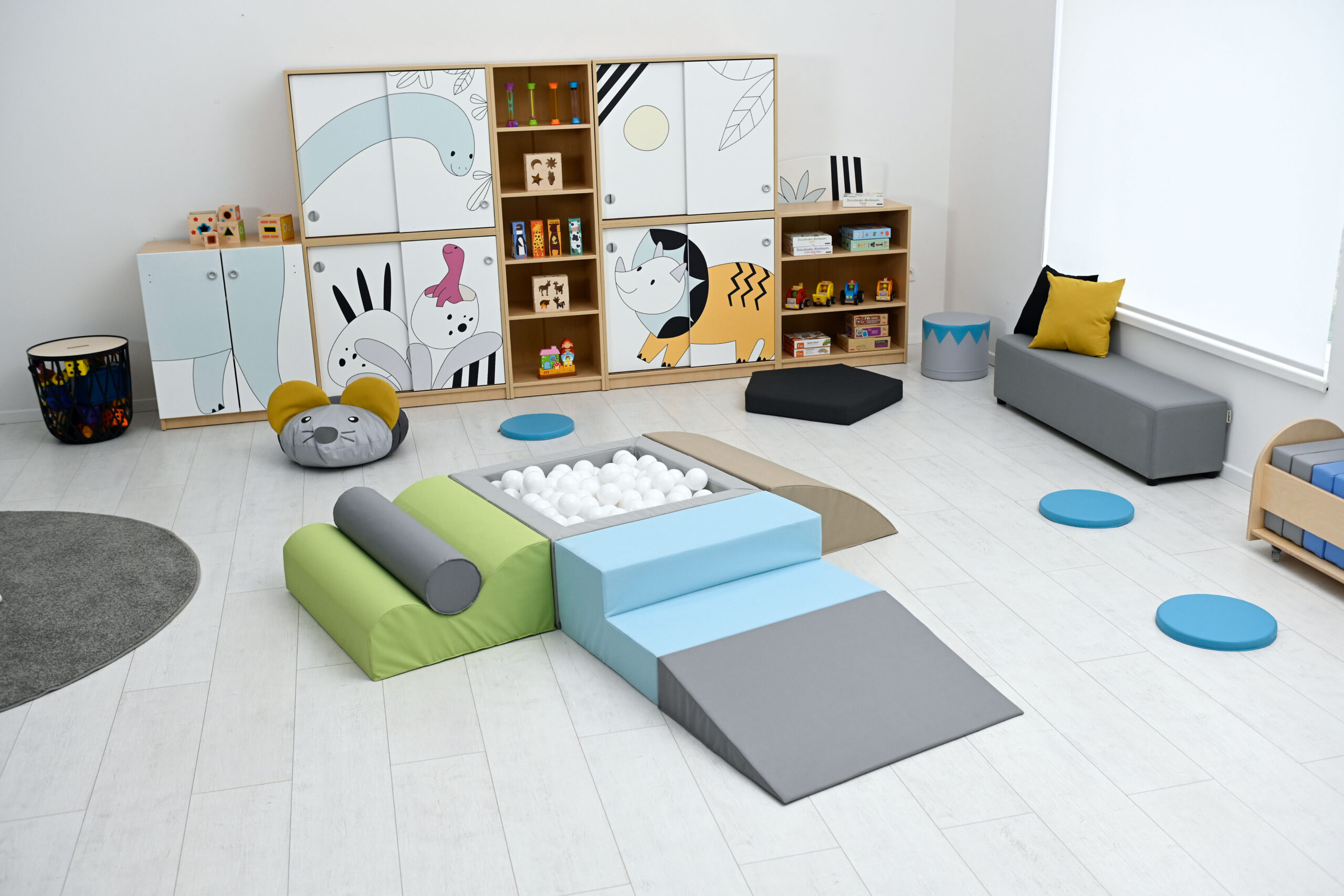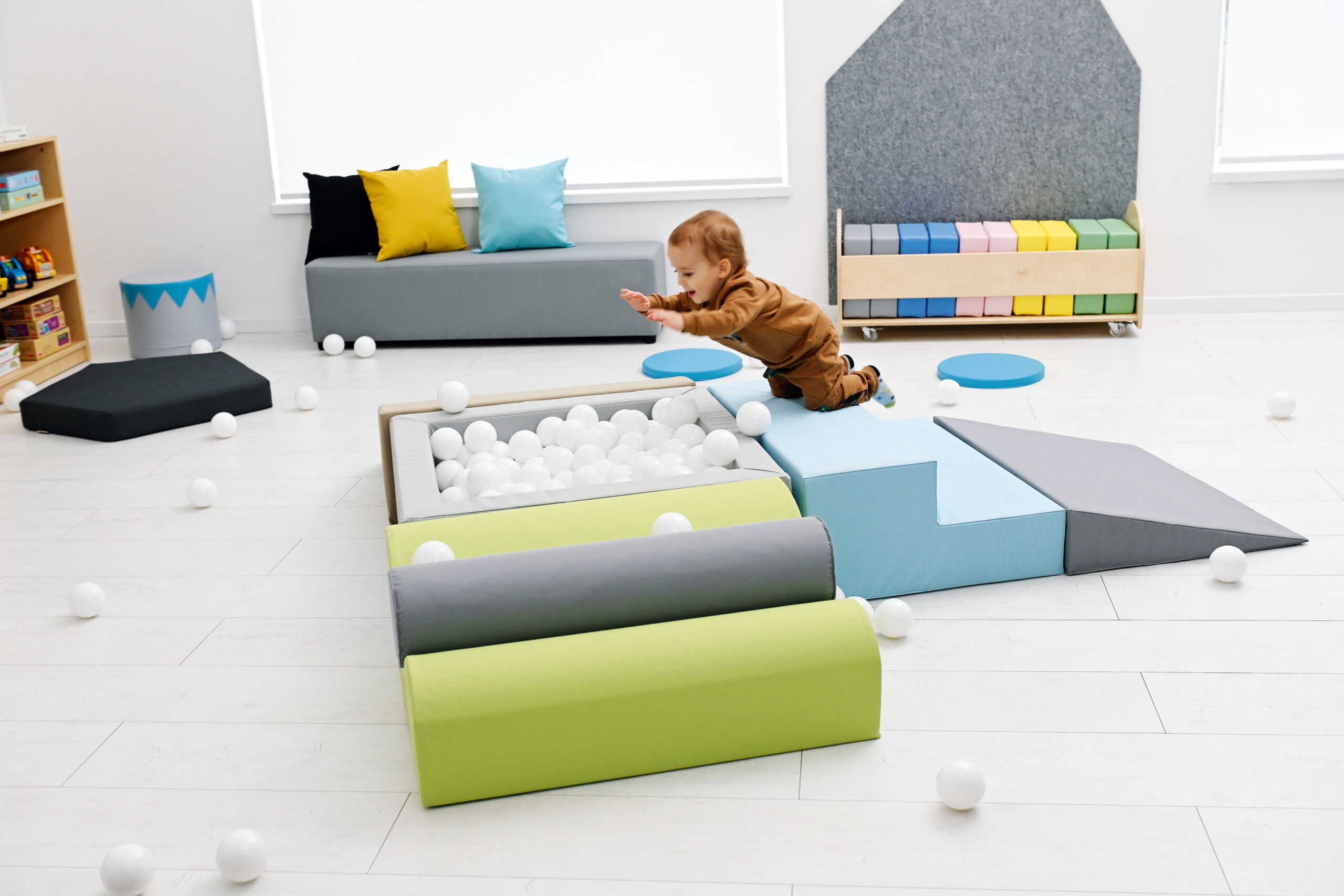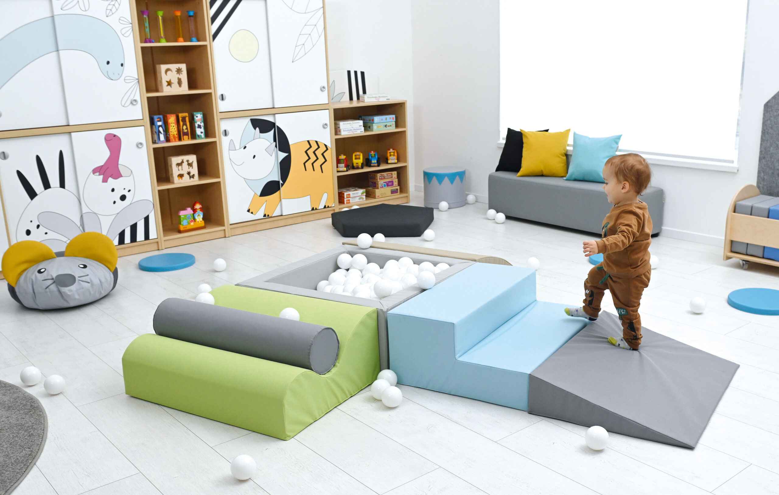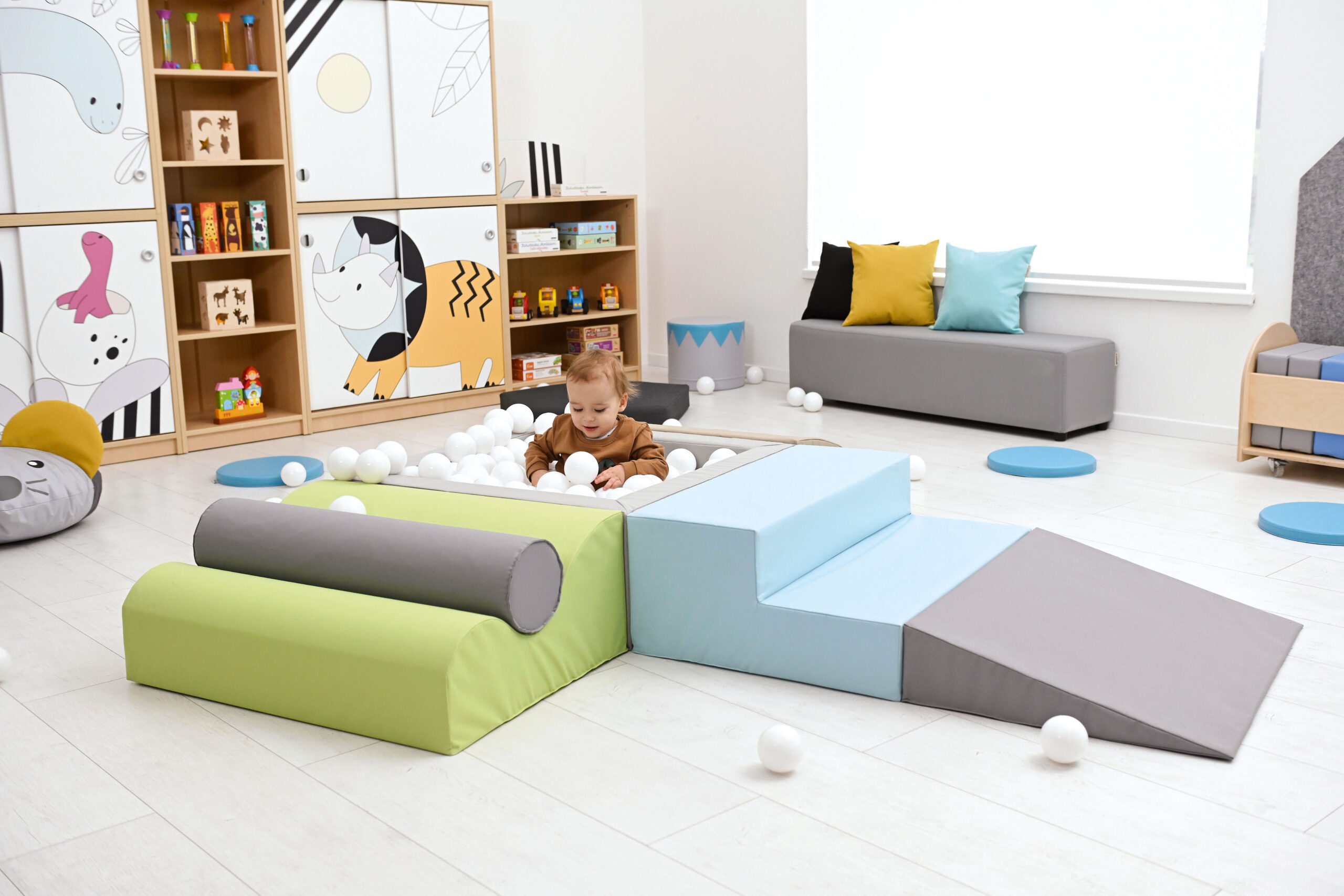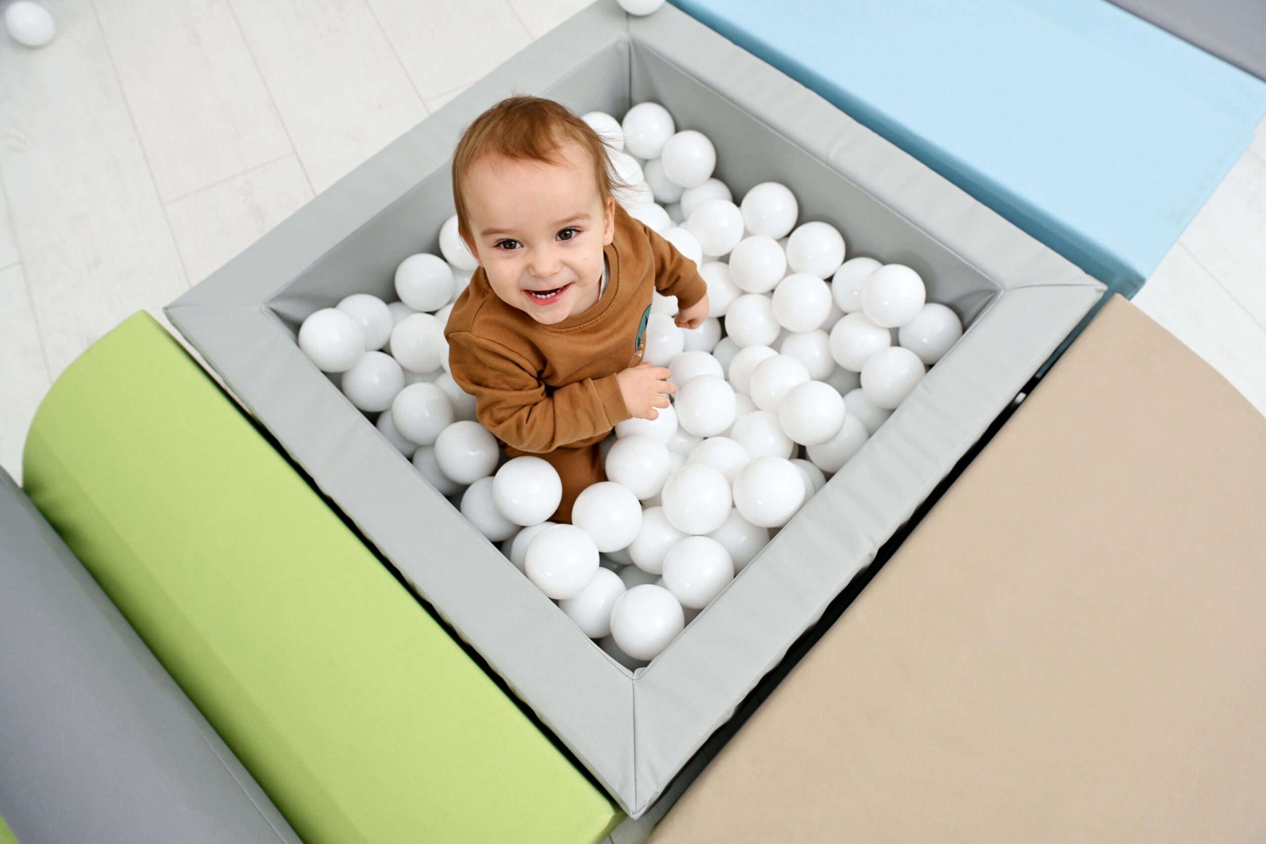 Pallidega bassein on väikelastele atraktiivne mängukoht. Komplekt sisaldab 3 vahtplastist sissepääsu basseini ning 250 hele sinist palli läbimõõduga 8 cm. Vahtplastist elemendid on kaetud vastupidava, kergesti puhastatava ja ftalaadivaba kangaga.